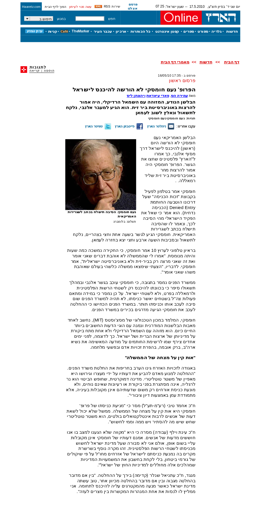נעם חומסקי ניסה להכנס לגדה כדי לתת הרצאה באוניברסיטת ביר זית. במעבר אלנבי מישהו פעל לפי הוראות למעלה (או לפחות לפי רוח המפקד) ומנע ממנו כניסה. אכן, אור לגויים. הכתבה למטה.